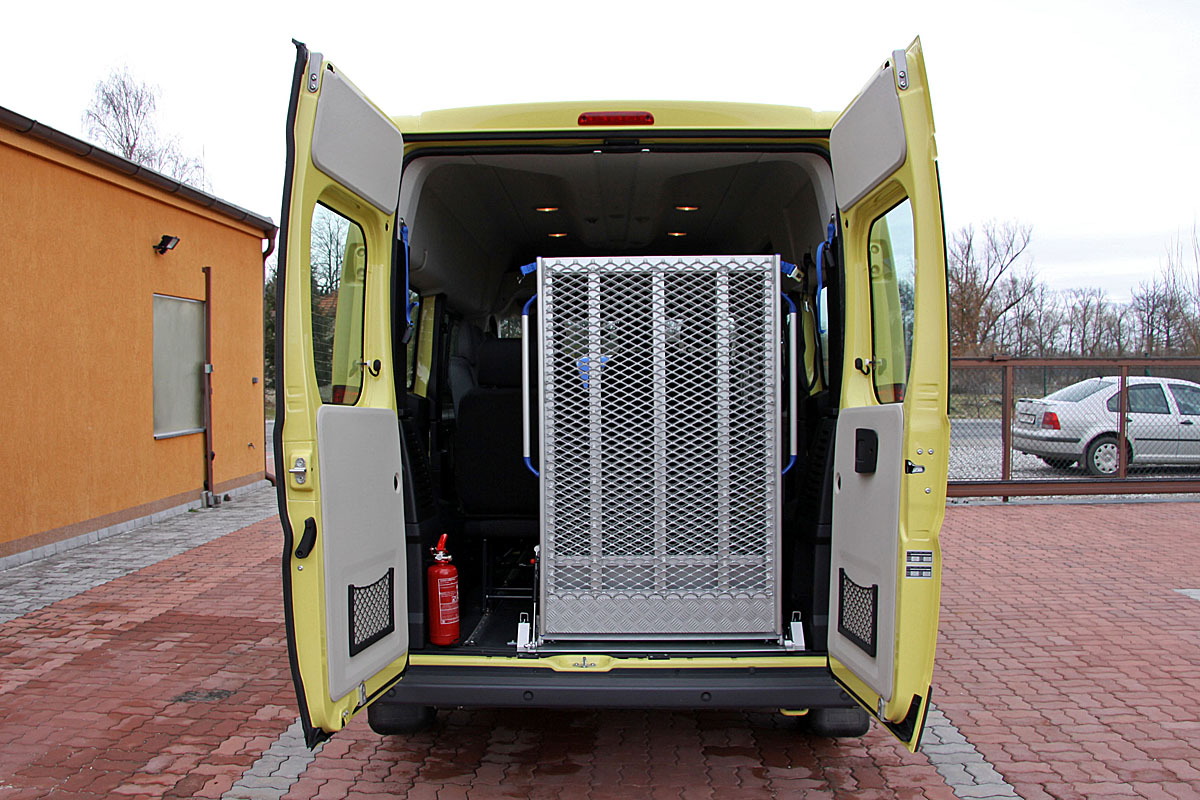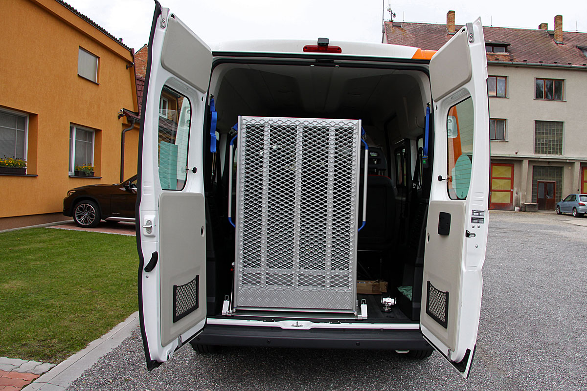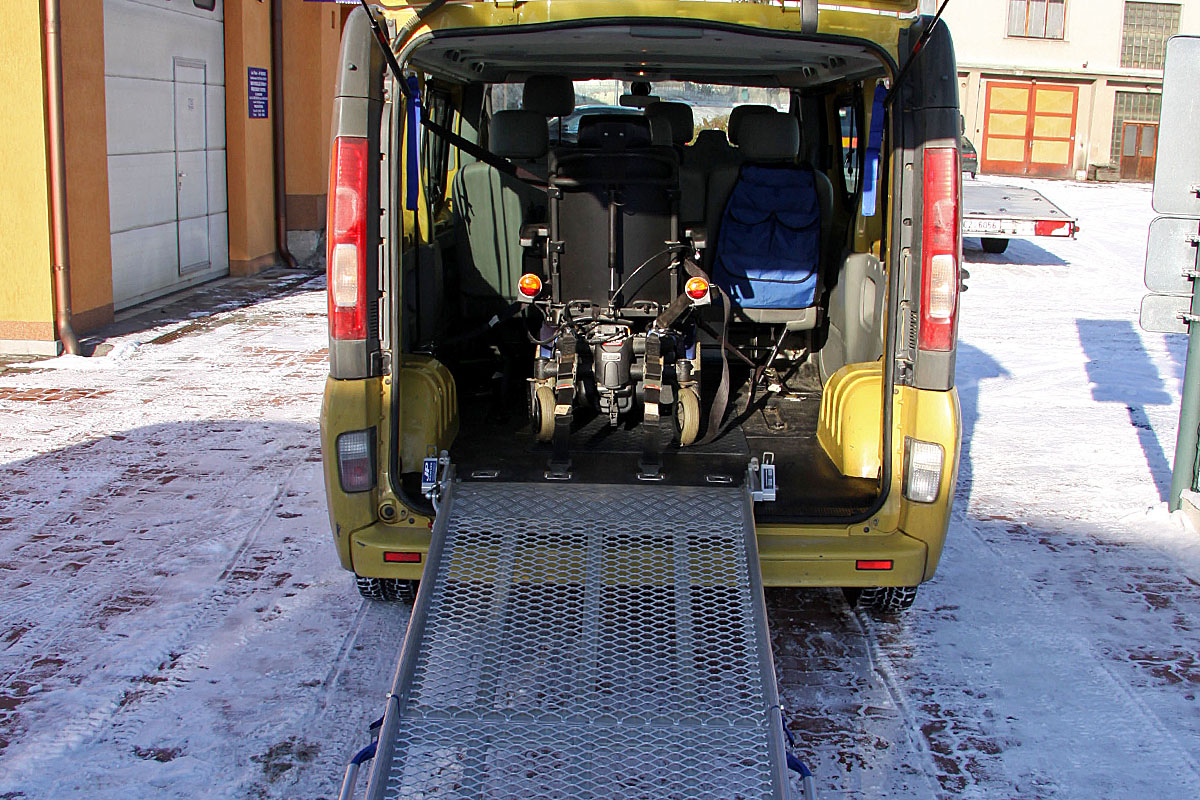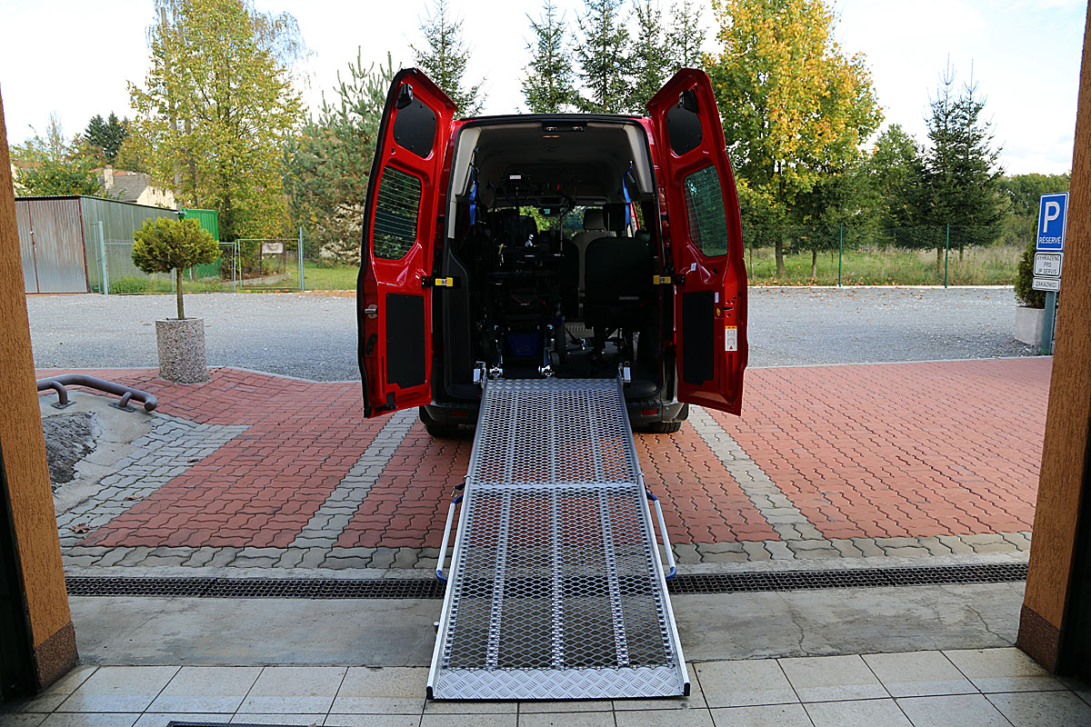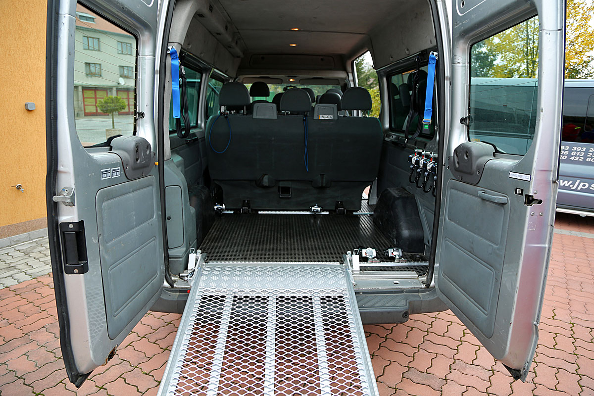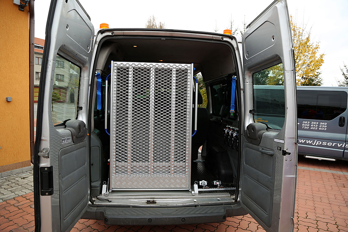 Nainstalované upínací zařízení vozíku, které zajišťuje bezpečné držení invalidního vozíku v příčném i podélném směru za jízdy, bezpečnostní pás a nastavitelnou opěrku hlavy pro bezpečnou přepravu postižené osoby na vozíku.
