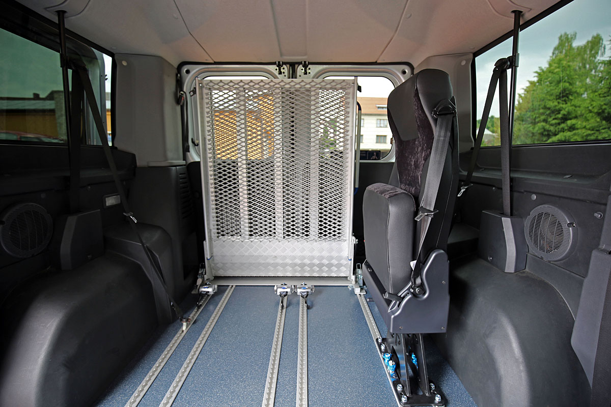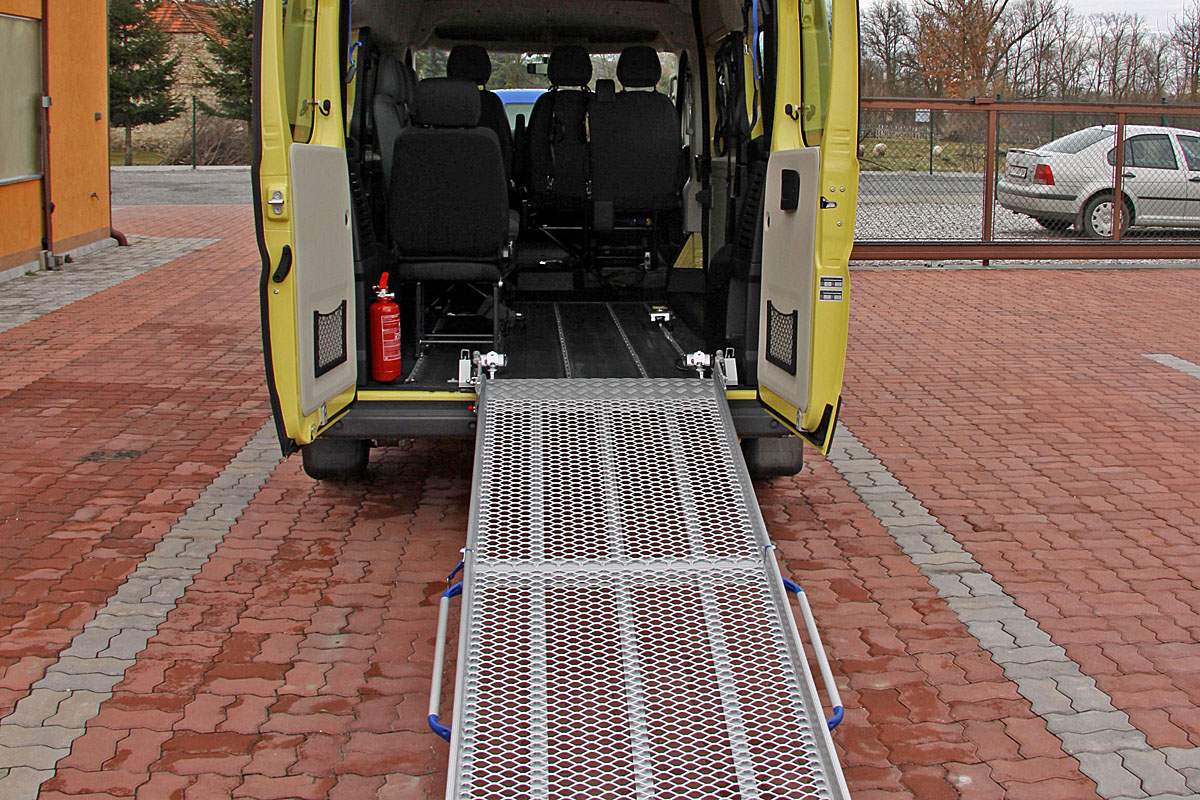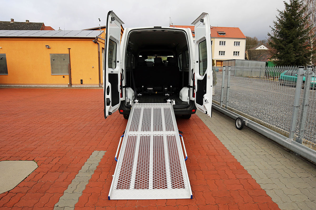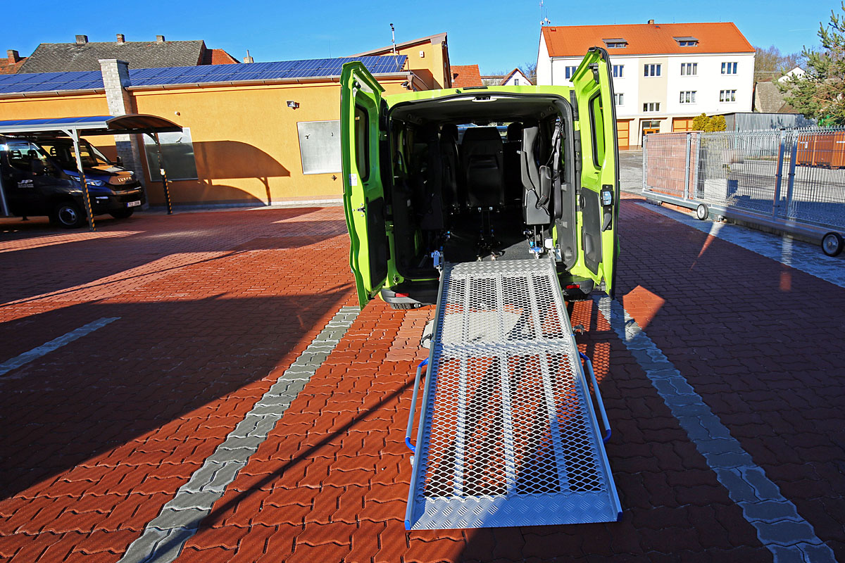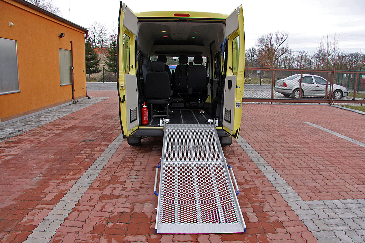 Nainstalované upínací zařízení vozíku, které zajišťuje bezpečné držení invalidního vozíku v příčném i podélném směru za jízdy, bezpečnostní pás a nastavitelnou opěrku hlavy pro bezpečnou přepravu postižené osoby na vozíku.