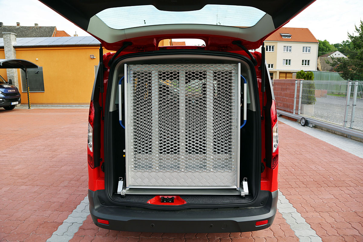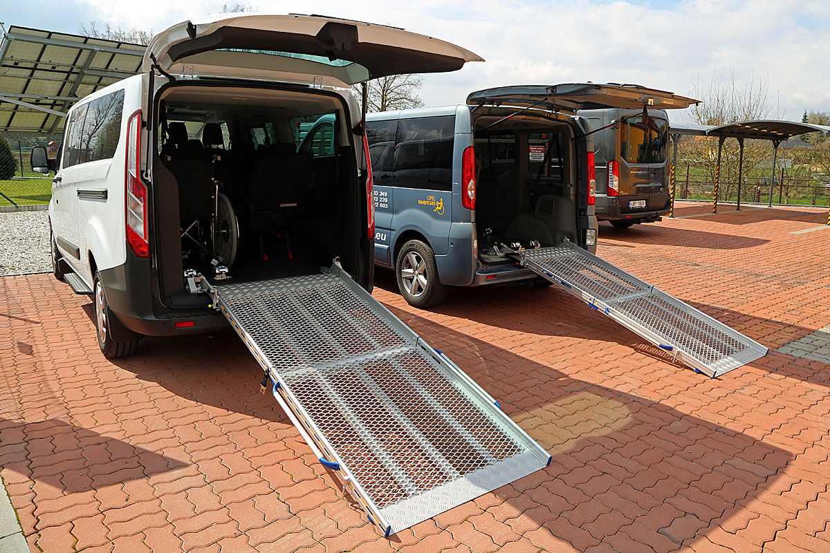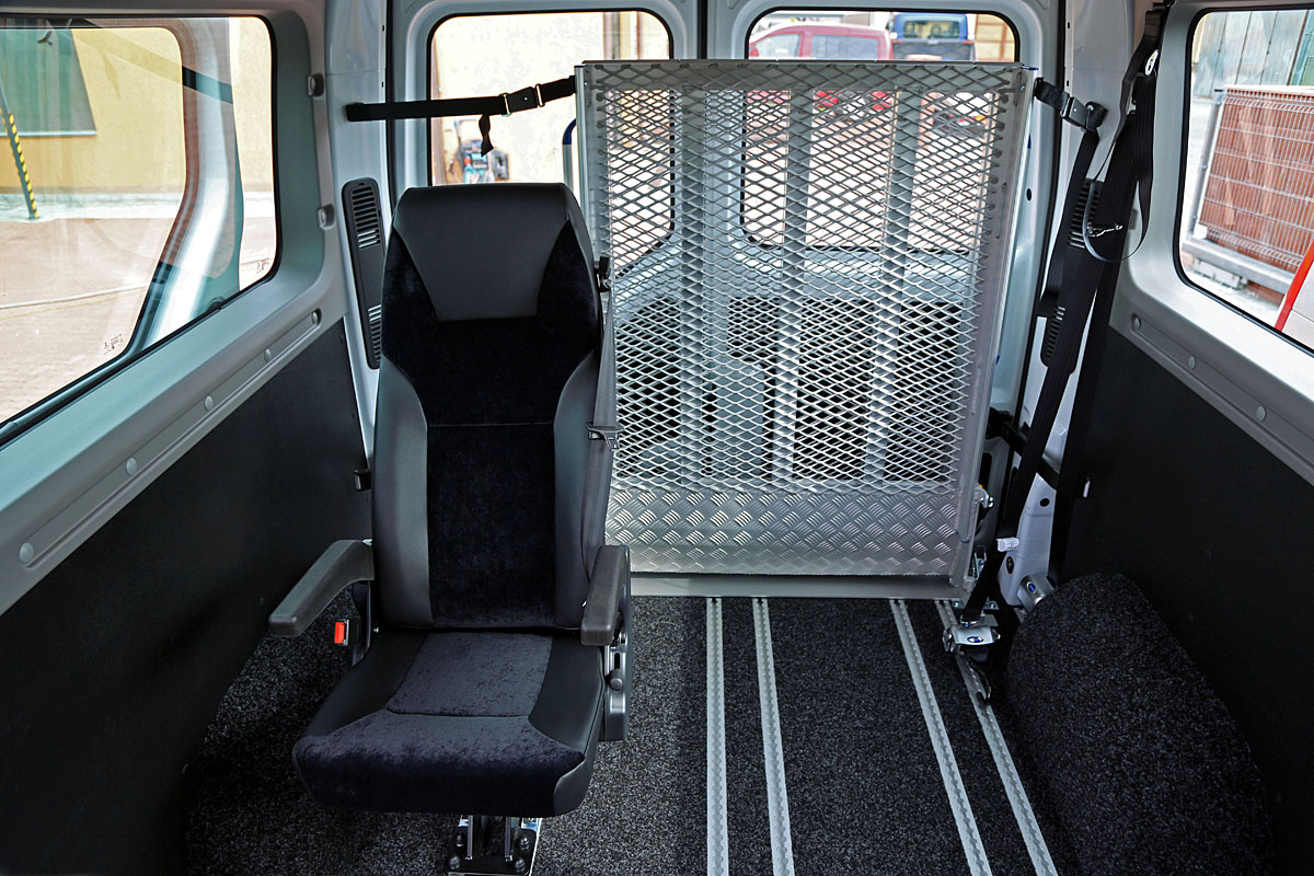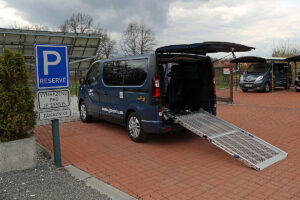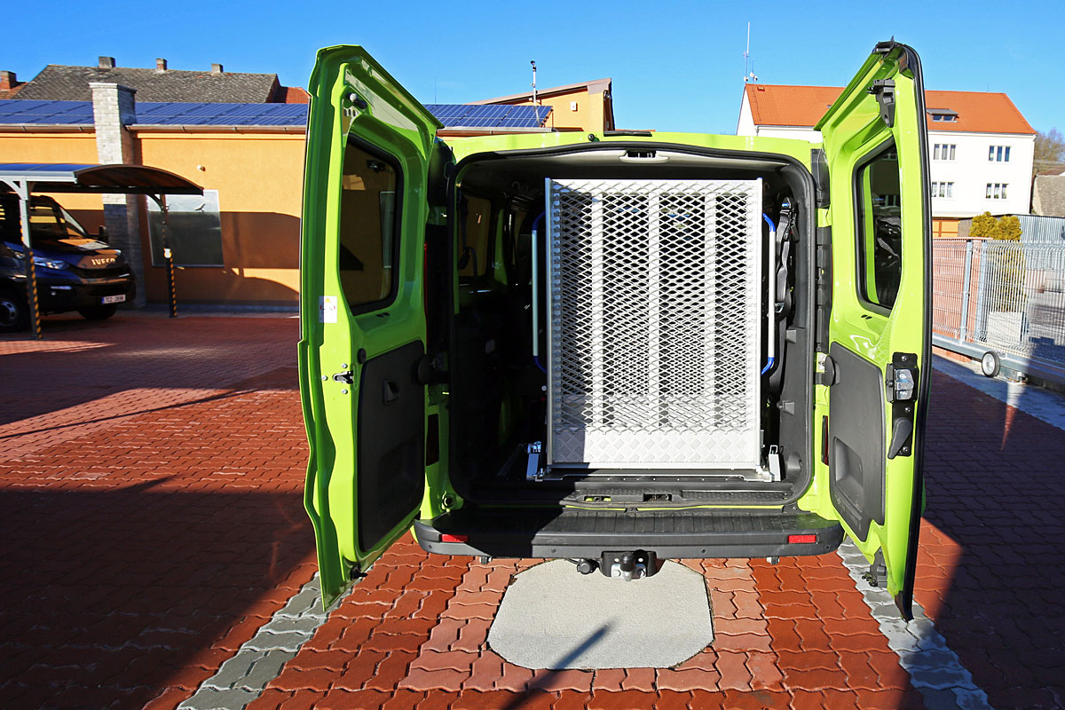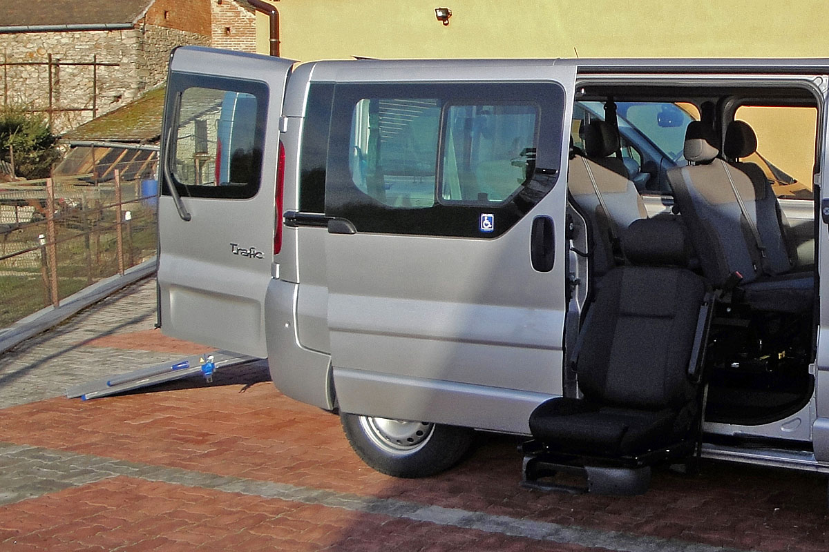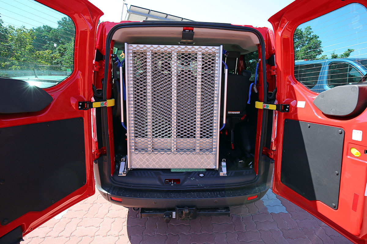 Nainstalované upínací zařízení vozíku, které zajišťuje bezpečné držení invalidního vozíku v příčném i podélném směru za jízdy, bezpečnostní pás a nastavitelnou opěrku hlavy pro bezpečnou přepravu postižené osoby na vozíku.