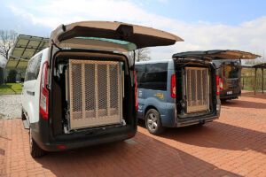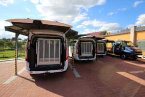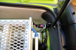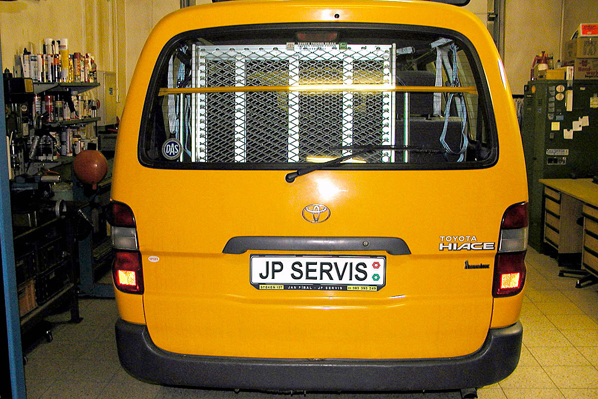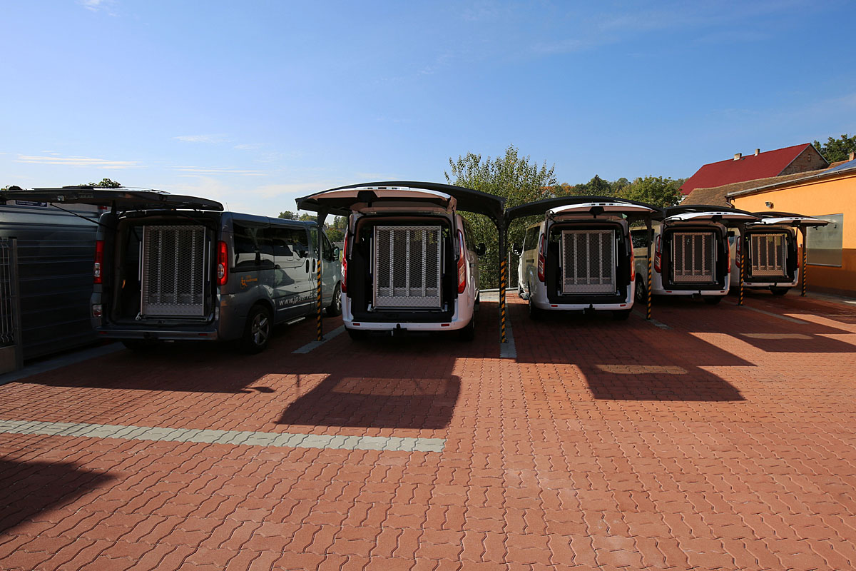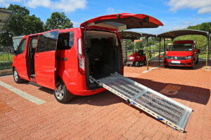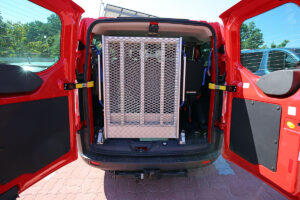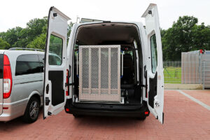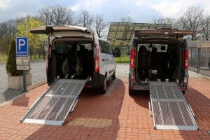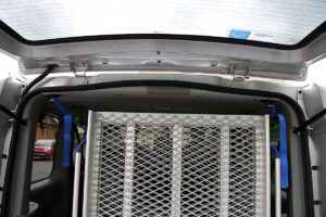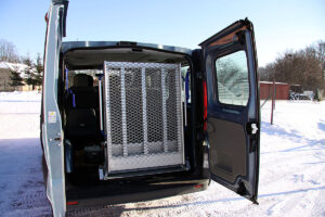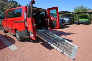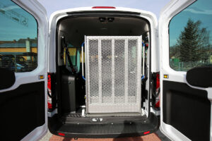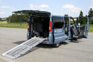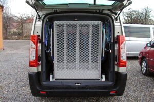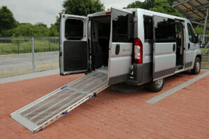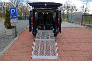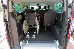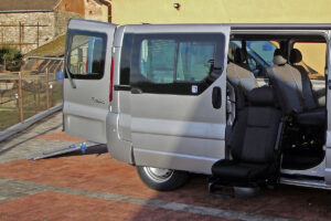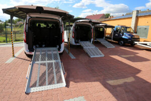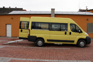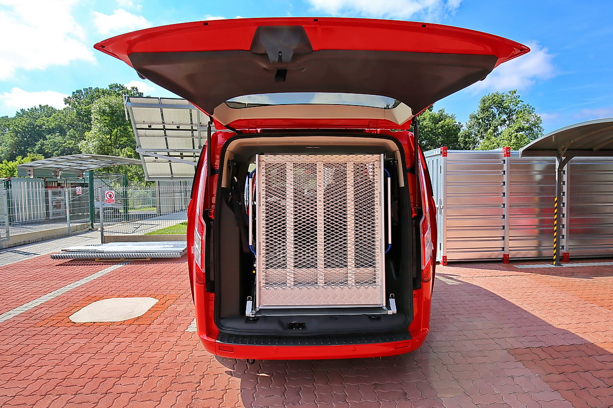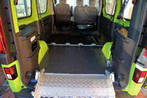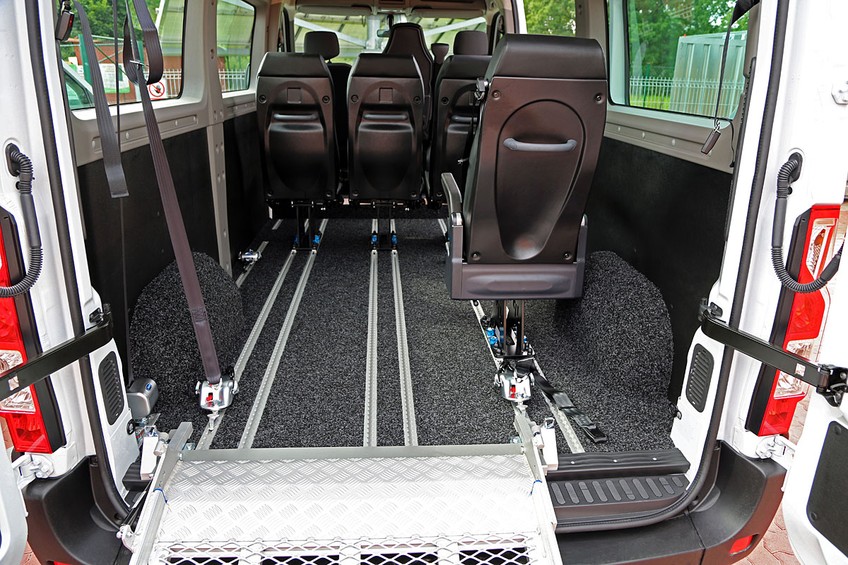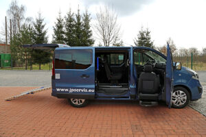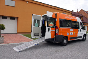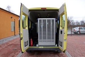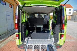 Nainstalované upínací zařízení vozíku, které zajišťuje bezpečné držení invalidního vozíku v příčném i podélném směru za jízdy, bezpečnostní pás a nastavitelnou opěrku hlavy pro bezpečnou přepravu postižené osoby na vozíku.