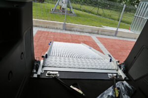 5. Pomocí madla zatáhneme za rampu směrem ven z vozu.