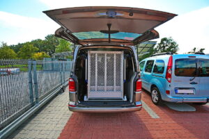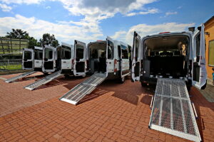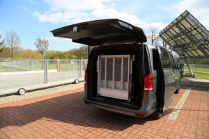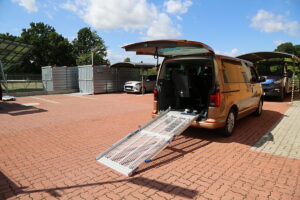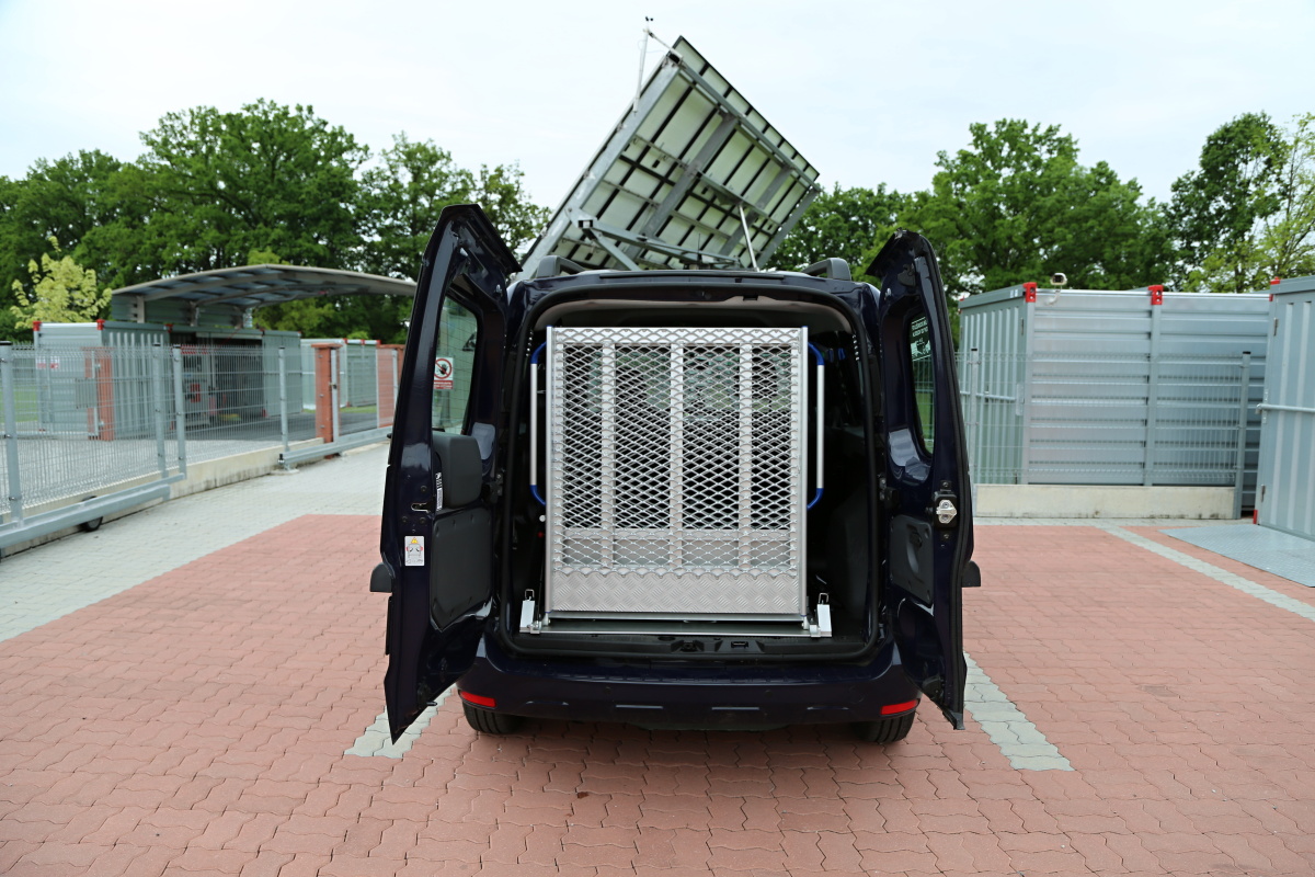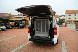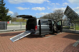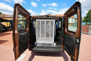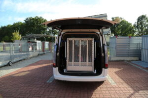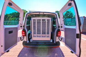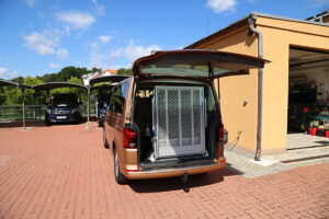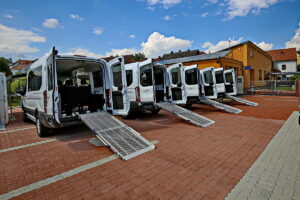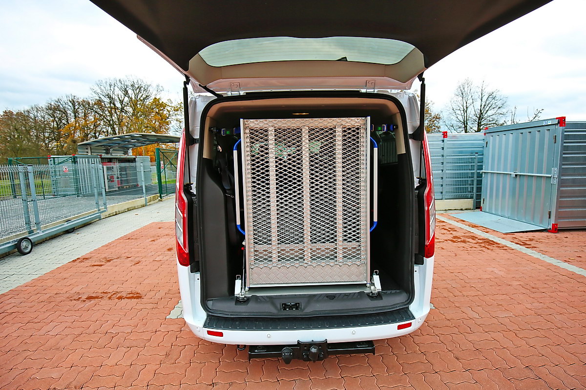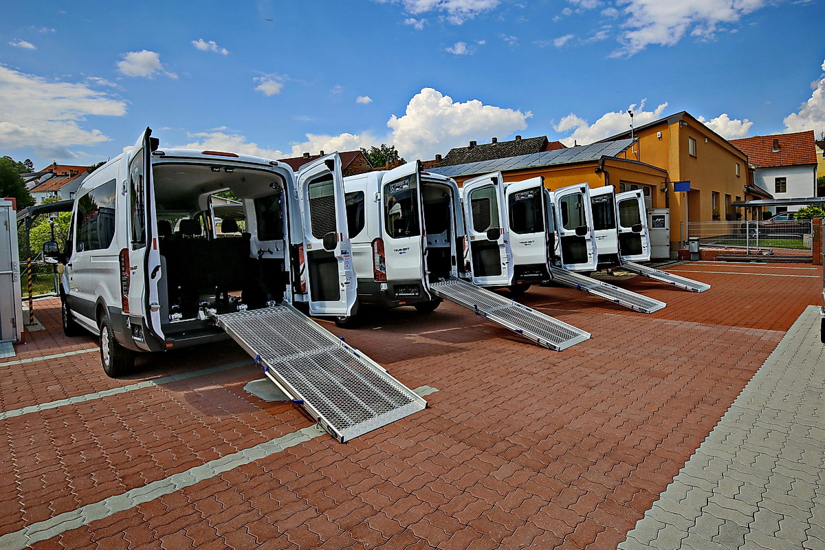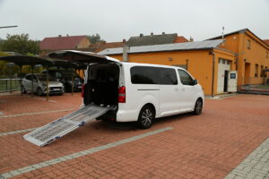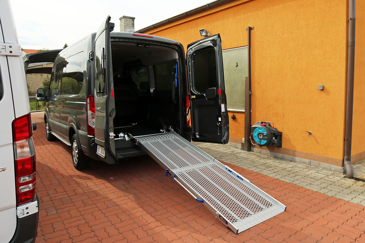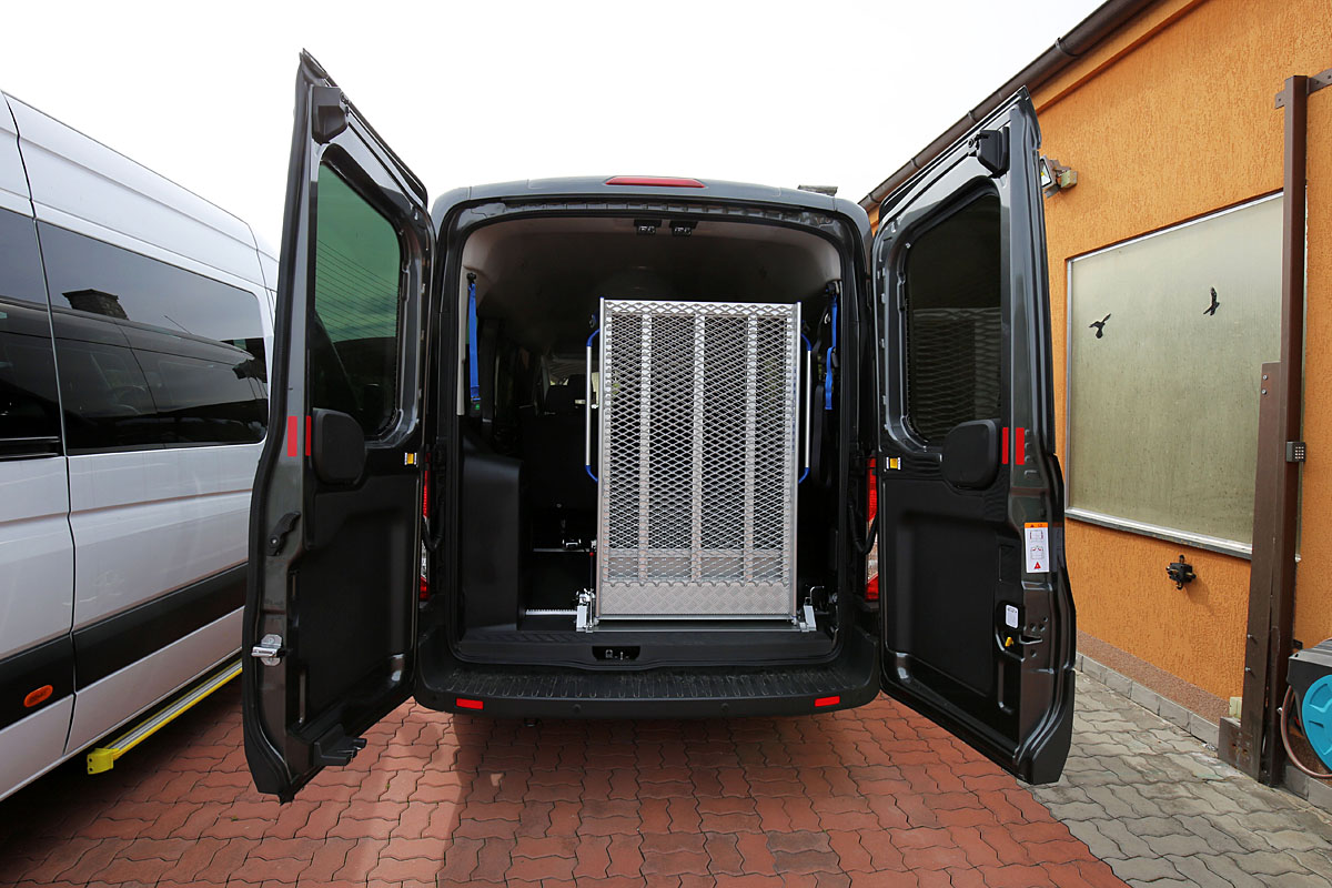 Nainstalované upínací zařízení vozíku, které zajišťuje bezpečné držení invalidního vozíku v příčném i podélném směru za jízdy, bezpečnostní pás a nastavitelnou opěrku hlavy pro bezpečnou přepravu postižené osoby na vozíku.